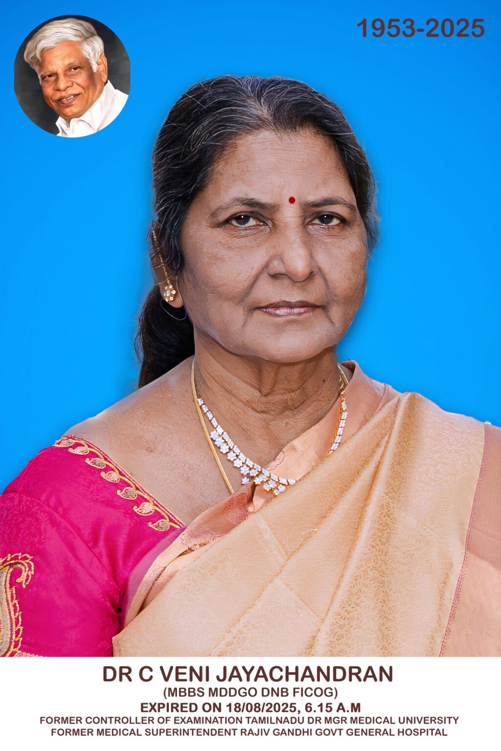 சென்னை வண்ணாரபேட்டையில் ஏழை மக்களுக்கு மிகக் குறைந்த கட்டணத்தில், மருத்துவம் பார்த்து பிரபலமான டாக்டர் S ஜெயச்சந்திரன் அவர்களின் மனைவி மற்றும் பிரபல மகேப்பேறு மருத்துவர் திருமதி C வேணி அவர்கள், இன்று காலை மாரடைப்பு காரணமாக மரணமடைந்தார்.