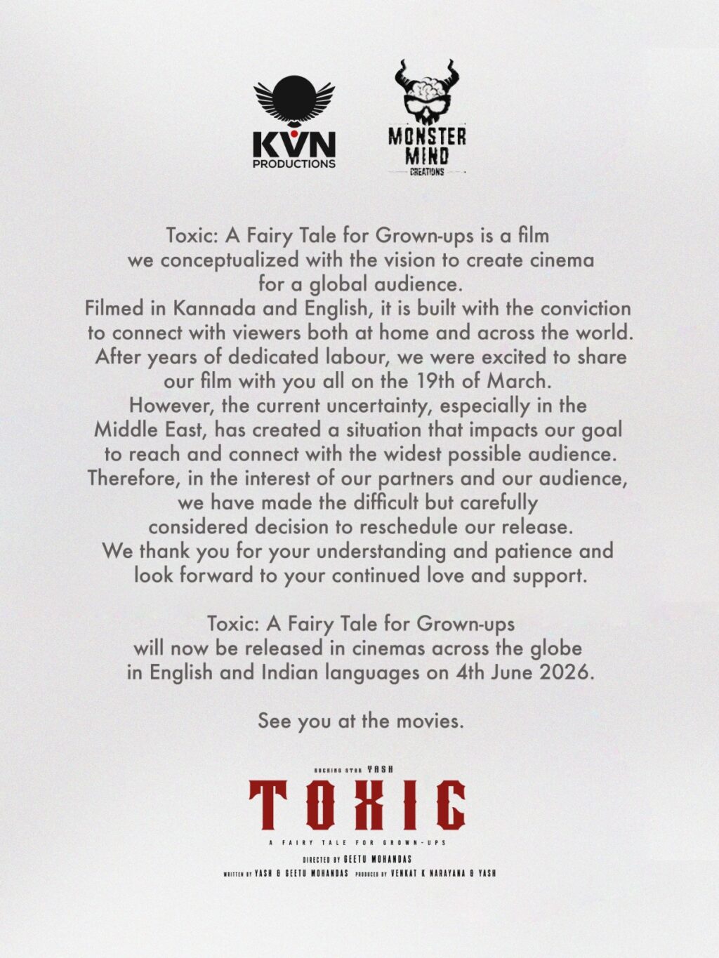 கே வி என் புரொடக்ஷன்ஸ் KVN Productions மற்றும் மான்ஸ்டர் மைண்ட் கிரியேசன்ஸ் Monster Mind Creations நிறுவனங்கள் இன்று மிகவும் எதிர்பார்க்கப்பட்ட ஆக்ஷன்-டிராமா திரைப்படமான ‘டாக்ஸிக்: எ ஃபேரி டேல் ஃபார் கிரோன்-அப்ஸ்’ படத்தின் உலகளாவிய திரையரங்கு வெளியீட்டின் மறுதேதியை நிர்ணயித்துள்ளதாக அறிவித்துள்ளனர். முதலில் 2026 மார்ச் 19 அன்று உலகம் முழுவதும் வெளியிட திட்டமிடப்பட்டிருந்த இந்த படம், தற்போது மத்திய கிழக்கில் அதிகரித்து வரும் பதற்றம் மற்றும் பிராந்திய அசாதாரண சூழ்நிலை காரணமாக இத்திரைப்படத்தின் வெளியீட்டு தேதி 2026 ஜூன் 4ஆம் தேதிக்கு மாற்றப்பட்டுள்ளது.