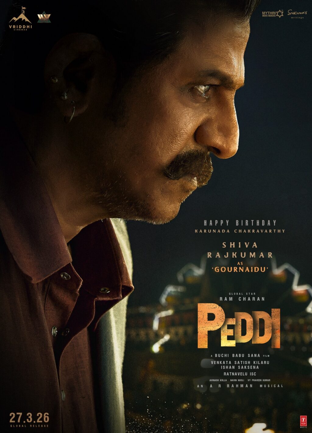இப்படத்தில் முக்கிய கதாபாத்திரத்தில் நடித்துவரும் கர்நாடக சக்கரவர்த்தி சிவராஜ்குமார் அவர்களின் பிறந்த நாளை முன்னிட்டு, இன்று அவரது காதாப்பத்திரத்தை வெளிப்படுத்தும் ஃபர்ஸ்ட் லுக்கை, படக்குழுவினர் வெளியிட்டுள்ளனர். கம்பீரமான பார்வை, கன்னத்தில் திருத்தப்பட்ட மீசை மற்றும் உருக்கமான தோற்றத்துடன், ‘கௌர்நாயுடு’ எனும் வீரமிகுந்த கதாபாத்திரத்தில் அவர் மிரட்டும் வகையில், ஃபர்ஸ்ட் லுக் அசத்தலாக அமைந்துள்ளது.